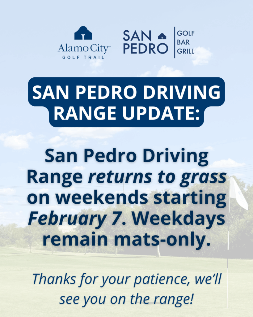 We’ve got an update for your next range session 👋 San Pedro Driving Range returns to grass on weekends starting February 7, with mats-only during the week. Thanks for bearing with us, we’ll see you on the range! ⛳ Experience San Pedro Driving Range and Par 3 TODAY!