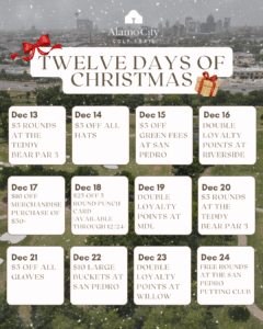 🎄✨ The Alamo City Golf Trail’s Twelve Days of Christmas Are HERE! ✨🎄Celebrate the season with exclusive daily deals across our San Antonio golf courses. Whether you’re shopping for the golfer in your life or treating yourself to some holiday fun, these limited-time offers are the perfect way to enjoy affordable golf, gear, practice buckets,…