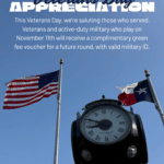 This Veterans Day, we’re showing our appreciation to those who serve. On Monday, November 11th, all veterans and active-duty military who play a round at any Alamo City Golf Trail course will receive a complimentary green fee voucher to use on a future visit.